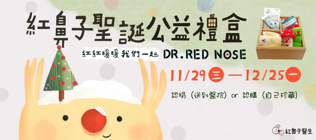 今年冬天,與紅鼻子醫生一起化身聖誕老人,為醫院裡的孩子送上一份與家人共同分享的禮物,在孩子們日復一日的療程裡,增添期待與儀式感,將驚喜與滿滿的愛送到孩子手中。紅鼻子醫生會將民眾認捐的禮盒送至11間醫院與居家照護的孩子,在漫長的療程中獻上一份祝福,陪伴他們度過最煎熬的治療時刻。活動目標義賣700盒,所得將支持紅鼻子醫生用於包含醫院、居家治療、兒童之家等醫療院所機構的孩童、照護者及醫護團隊之演出服務、專業小丑醫生培訓,為治療的路上創造更多笑聲。
