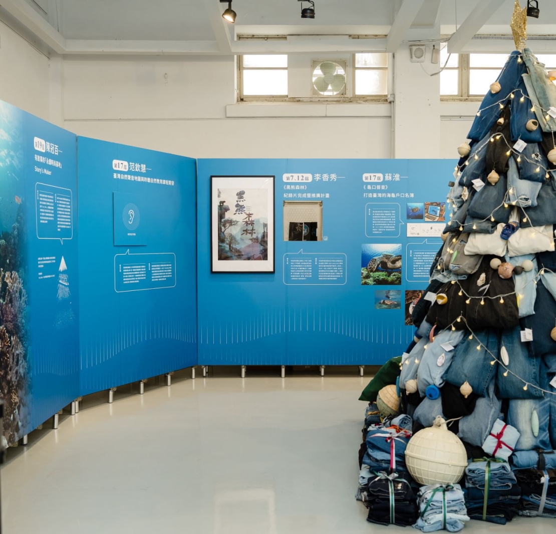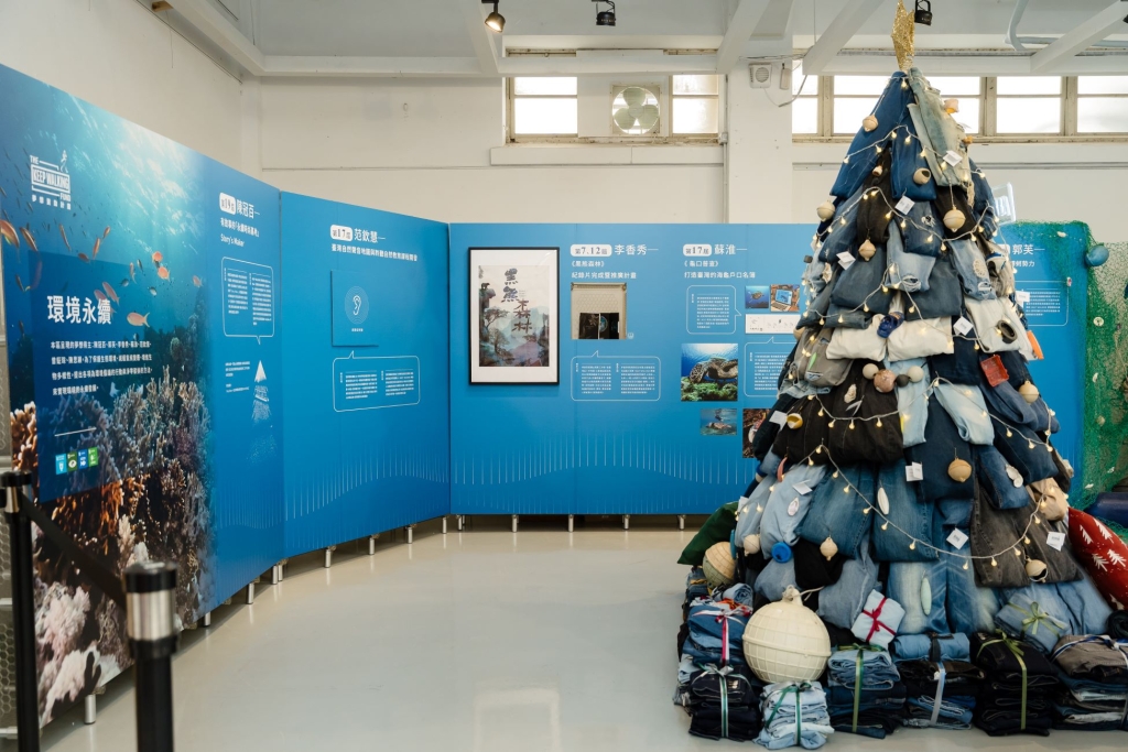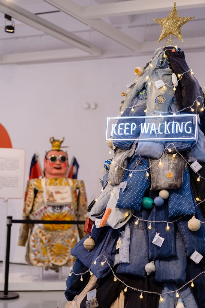 號召民眾、內部員工,捐出家中廢棄牛仔褲共創而成,逾百件的牛仔褲打造出 2.5 公尺高的「藍色」聖誕樹,不僅是展場最吸睛的裝置藝術,更展現 KEEP WALKING 夢想資助計畫對於永續的高度重視。而回收牛仔褲於展後也會再回捐給永續時尚品牌、同時也第 19 屆 KEEP WALKING 夢想資助計畫得主-陳冠百的團隊 Story Wear,除了讓牛仔布能再生運用,也幫助在地婦女二度就業。