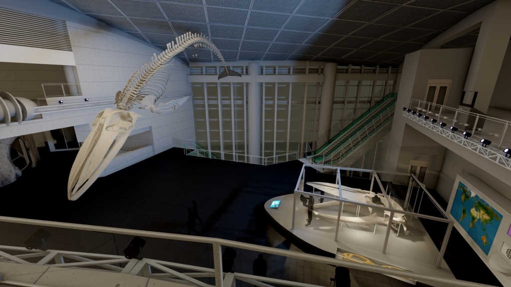 這頭藍鯨在海上漂流數月,最後擱淺在臺東,海生館匯集國內、外專家學者意見,力求骨骼組裝及展示姿態之科學正確性,經不斷討論、求證、比對、試組裝等過程,終於完成藍鯨骨骼標本的製作,並模擬捕捉藍鯨下潛剎那的優雅動作,仿佛描繪著一場重返海洋的儀式,展現出藍鯨動態美感與生命力。