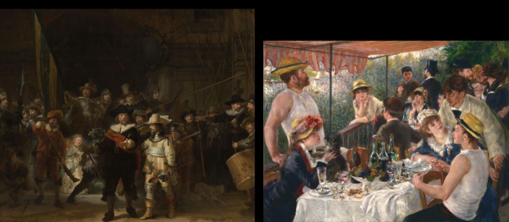 西方著名的風俗畫也不少,如荷蘭黃金時代畫家林布蘭的《夜巡》(The Night Watch)、法國浪漫主義畫家德拉克洛瓦的《自由引領人民》(Liberty Leading the People)、法國印象派畫家雷諾瓦的《划船派對的午餐》(The Luncheon of the Boating Party)…等,在藝術史上占有重要地位,也為後世留下了珍貴的文化遺產。
