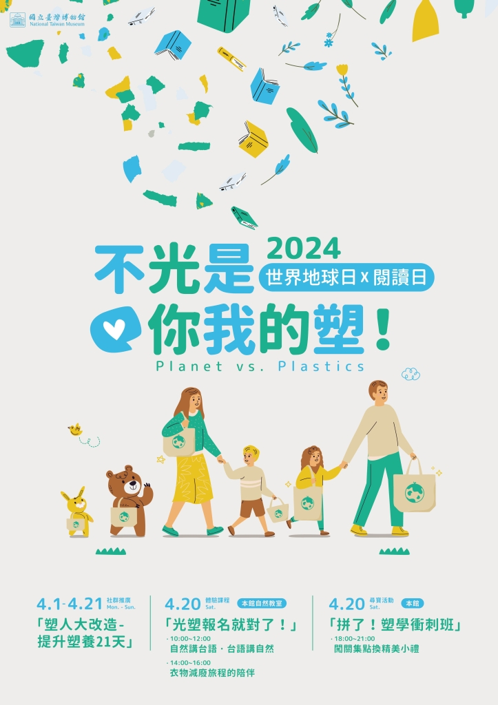 2024年世界地球日主題為「Planet vs. Plastics(地球與塑膠)」,國立臺灣博物館即日起推出「不光是你我的塑!」綠色行動體驗活動,4月20日臺博館本館特別延長開館至晚間9點30分,透過語言學習互動課程、快時尚講座及舊衣再造手作、夜間尋寶及網路串連活動,呼籲大眾從日常生活的細微改變開始,減少對塑膠的使用,共同實踐永續發展的理念。