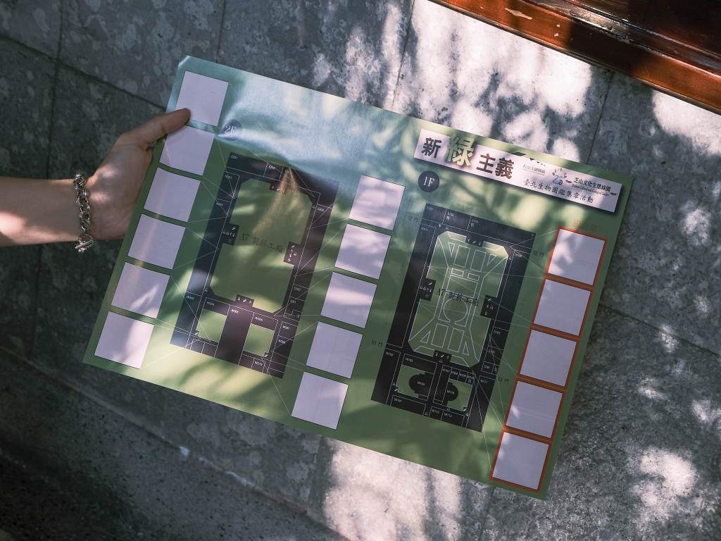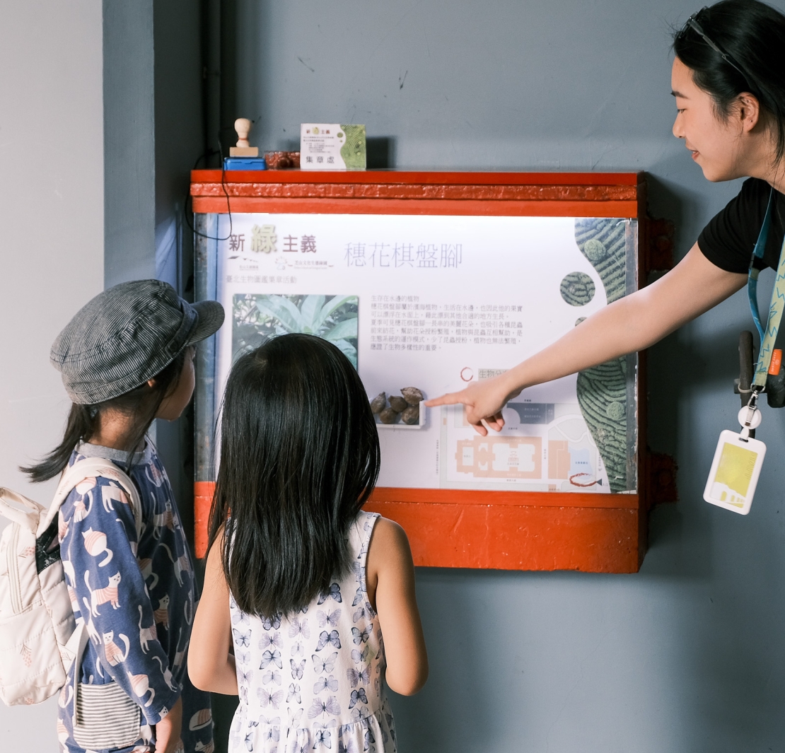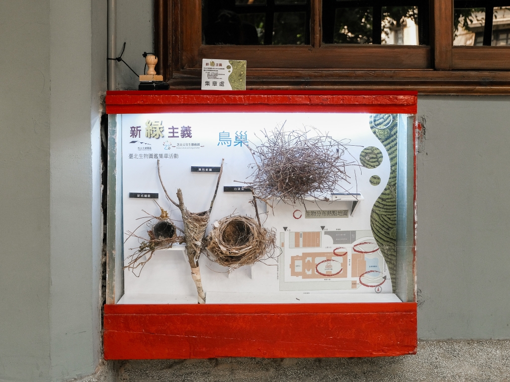 《新綠主義-臺北生物圖鑑集章活動》聚焦於環境生態踏查的成果,精選園區內16種常見且具有特色的鳥類、植物和昆蟲,例如曾被列為瀕危野生動植物的綬草,及生物水晶標本如三角蜻蜓、橙頭土蜂、台灣長尾水青蛾等,還特別展出斯氏繡眼、黑枕藍鶲及白頭翁的鳥巢,掃描QRcode即可聆聽鳥叫聲及活動影片,透過多種媒介靈活呈現生物多樣性。