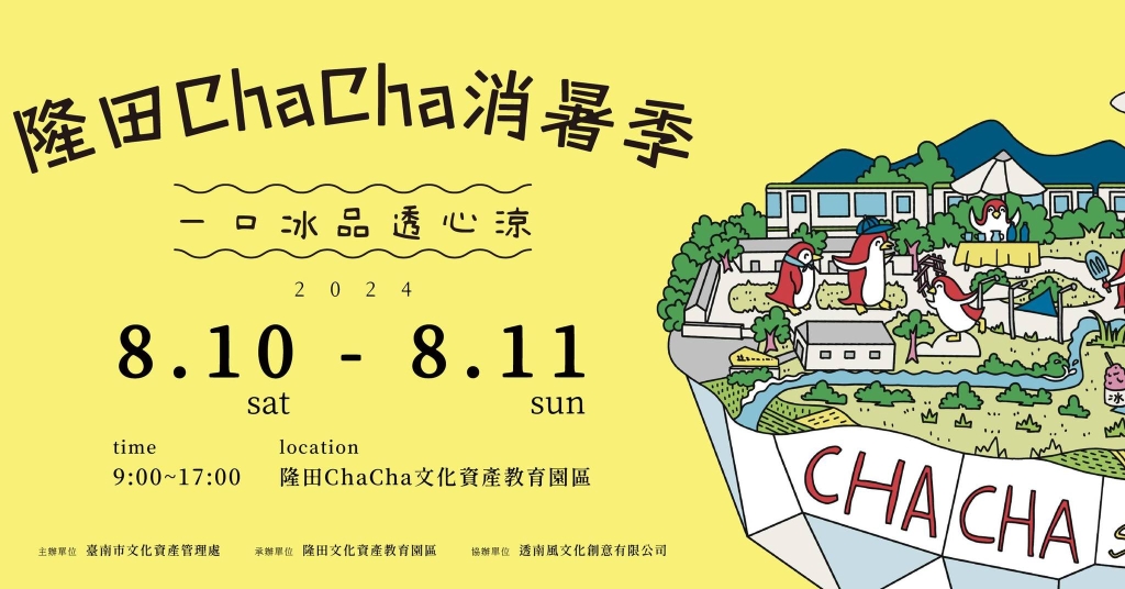 隆田Cha Cha園區迎接夏至來臨,於8/10-8/11舉辦「隆田ChaCha消暑季」,配合烏山頭水庫灌溉放水,園區內水圳支流預計當天也將開放民眾體驗,並擴大舉辦以「冰品」主題的系列活動,包括冰品市集,現場15攤包括不同類型的冰飲品、熟食及手工藝攤商,還有live音樂表演、小小冰品店長DIY(採事先報名),以及冰品闖關活動,闖關還可獲得企鵝造型氣球,數量有限,歡迎民眾相揪一起來隆田Cha Cha園區消暑一「夏」。