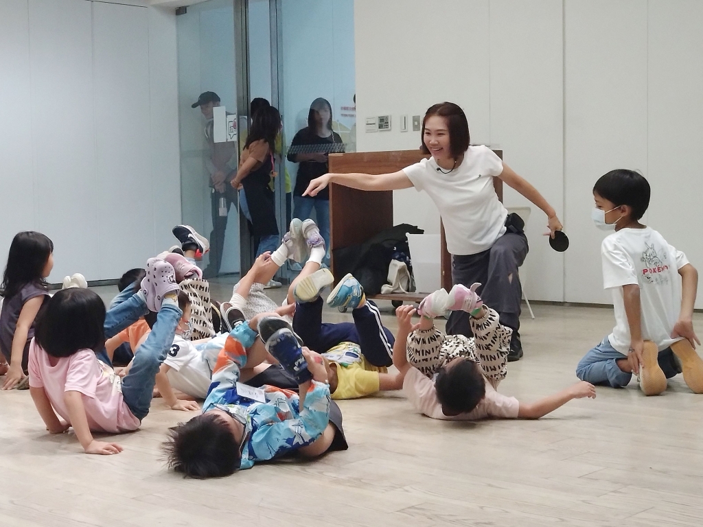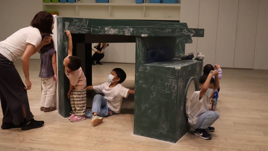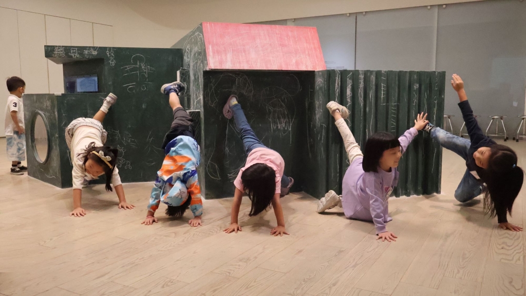 策展團隊體認到,展區很多的藝術品和體驗裝置都比較適合學齡的孩子。他們希望也有讓幼齡孩子能體驗空間的設計。因此,他們邀請雲門教室策畫屬於4-7歲孩子的「帶著形狀去跳舞」律動工作坊,讓孩子用身體來感受形狀與空間的微妙關係。