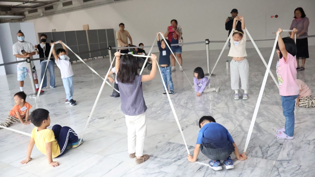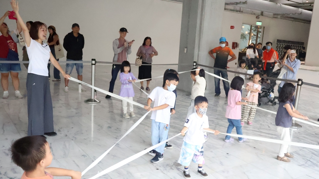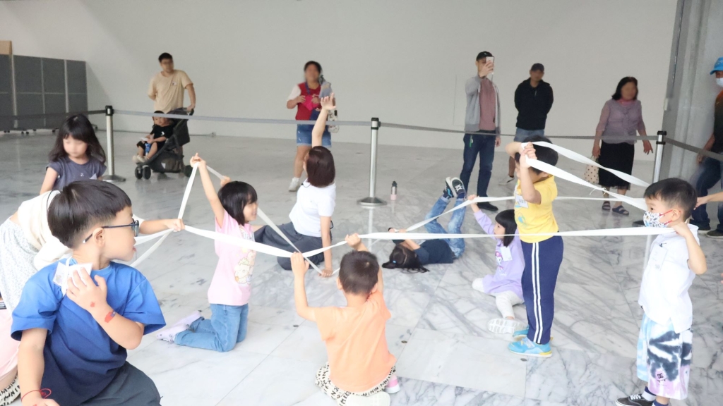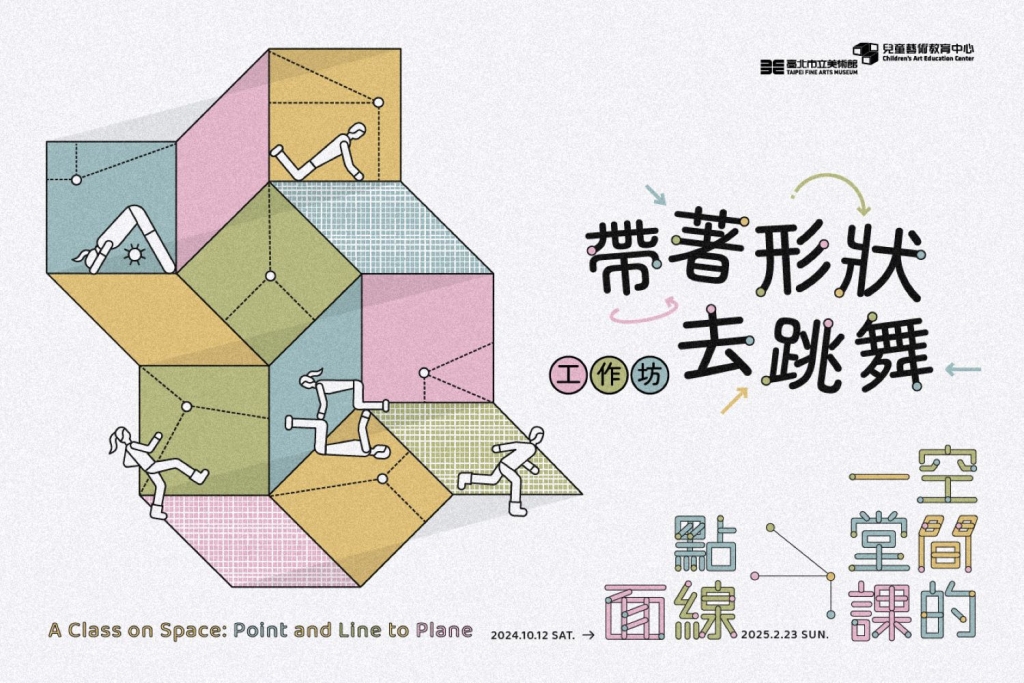 這是臺北市立美術館兒童藝術教育中心(以下簡稱兒藝中心)為當期展覽「空間的一堂課:點線面」所舉辦的律動工作坊,讓4-7歲的孩子以空間為畫布,身體為彩筆,詮釋空間結構的基本元素 : 點、線、面。