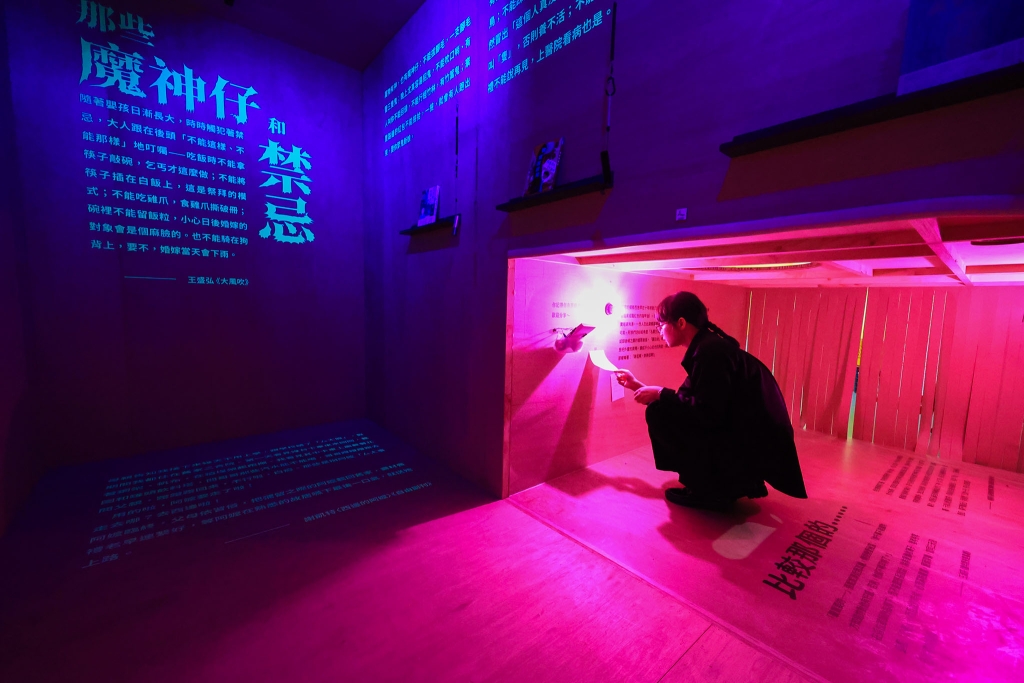 第六區「小時候的黑洞」展區是充滿創意的空間設計,大型木箱讓你我彎下腰躲進去,黑暗中的螢光字與黑影晃動,充滿孩子們小時候「国仔復有耳冇嘴」在長大途中又驚又怕的曾經,展區特別規劃了在黑洞的展區遇見小時候。