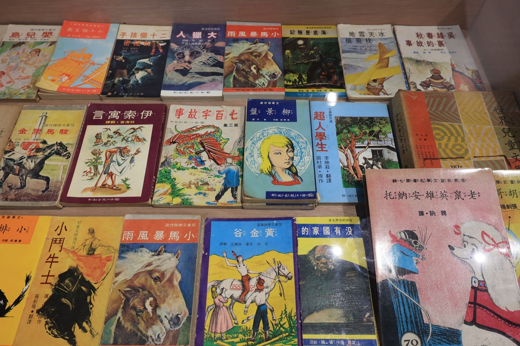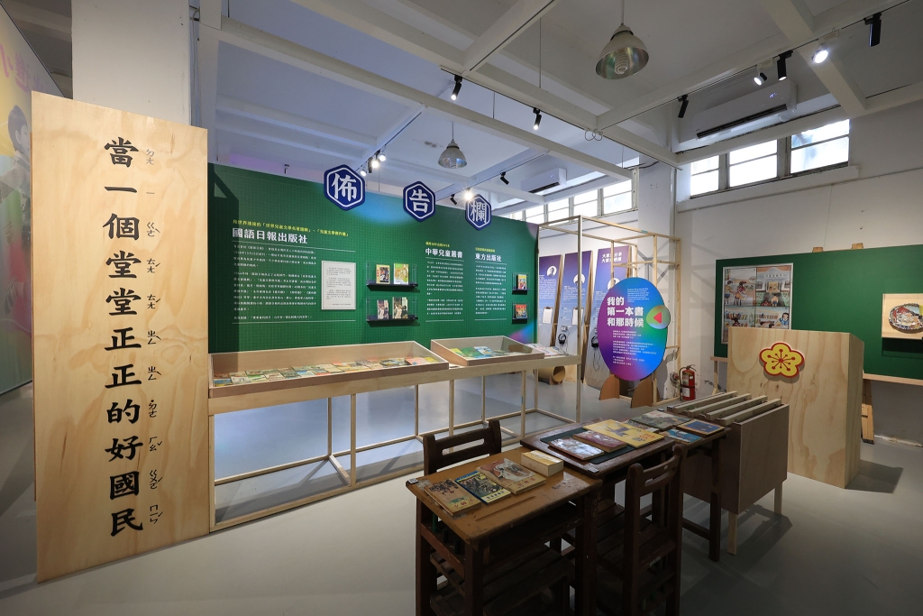 展區四:「陪我們長大的那些書」,則特別打造了小學的教室場景,播放台灣人成長中重要節目:每日一字外,還陳設了國語日報、中華兒童叢書、東方出版社、信誼、小魯、遠流、聯經、漢聲等出版社的歷史和出版品,特別商借收藏家提供超過60本的絕版童書,是台灣兒童書籍出版史的重要見證。