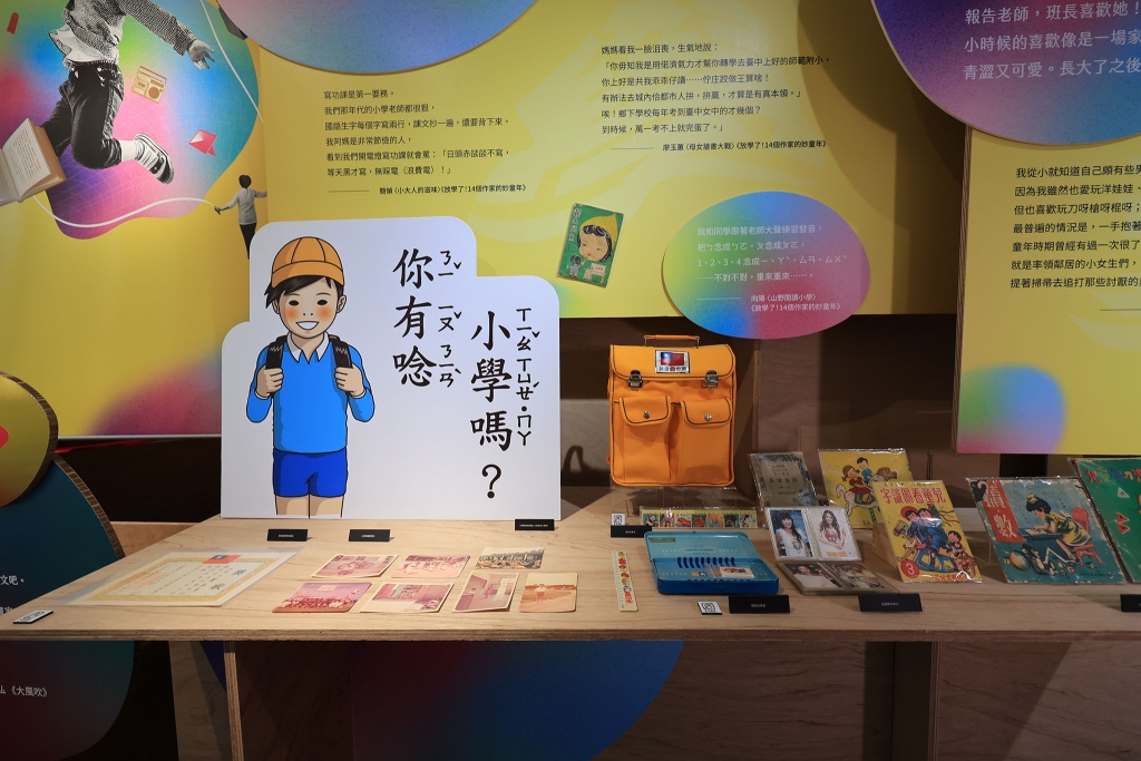 展區一:「我們一起的小時候」,呈現台灣人經歷過的小時候時光;在作家向陽筆下寫下:「我和同學跟著老師大聲練習發音,把ㄅ念成ㄅㄛ,ㄆ念成ㄆㄛ,1、2、3、4念成ㄧ、ㄚˋ、ㄙㄢ、ㄙㄨˋ──不對不對,重來重來……」。金馬獎最佳動畫片《幸福路上》中的小琪說:「蝦咪系幸福啊?」,搭配民生國小朋友朗讀:「爸爸捕魚去」,以及各式珍貴文物,六十多位作家筆下的台灣各地域、各時代的生活,一一呈現;作家馬翊航寫下有五燈獎陪伴的童年,現場特別呈現歌手張惠妹當年五燈獎參賽影片,獲得很多民眾討論曾經一家人看電視的記憶。