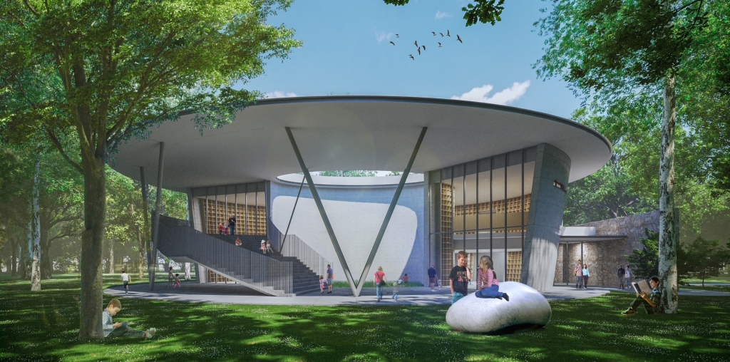 「童書之森.台中」是安藤忠雄建築師為孩子設計打造的圖書館,以森林包覆的橢圓形建築為主要特色,以安藤忠雄建築師常用的清水模為主要的工法材料,透過環繞式的書牆設計,豐富孩子們的空間體驗,也讓喜歡安藤建築師作品的大人可以親臨大師作品,為台中市閱讀版圖增添國際亮點。