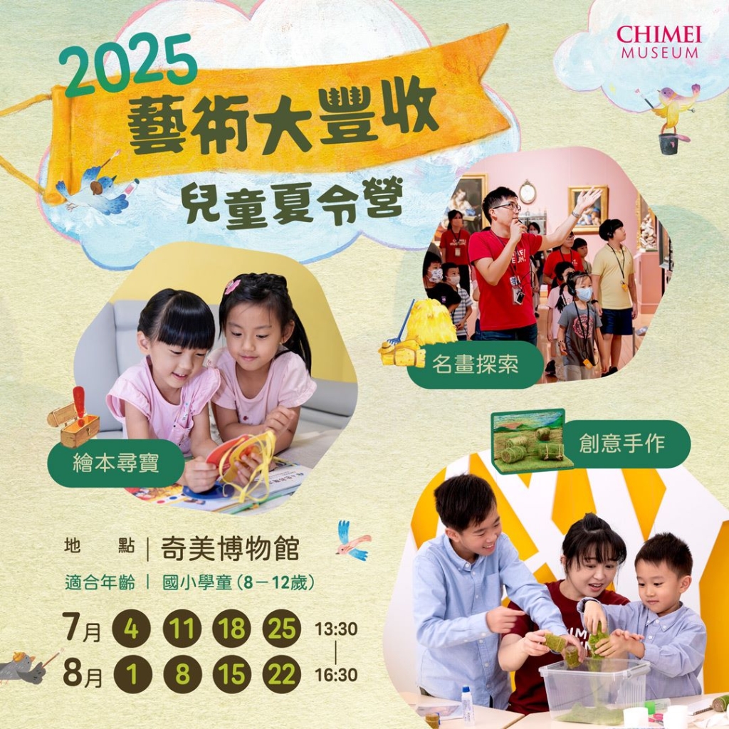 2025「藝術大豐收」兒童夏令營將於7、8月每週五下午13:30至16:30舉行,對象為8至12歲兒童,每場次上限15位。營隊費用內含3小時活動學費、《My Harvest Journey我的大豐收─畫作尋寶祕笈》立體童書、活動教具與創作材料,並贈送2張奇美博物館常設展全票(價值400元)。報名費用原價2,500元,5/12至6/15推出早鳥9折優惠2,250元。報名請洽ACCUPASS 活動通https://reurl.cc/M369jk詳情請上奇美博物館官網:www.chimeimuseum.org 。