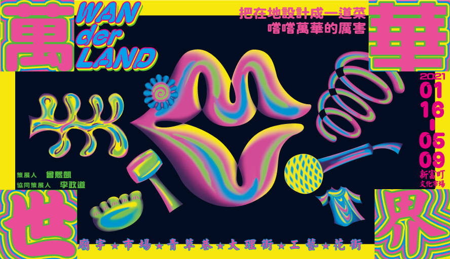忠泰建築文化藝術基金會自2017年扎根萬華,將歷經八十多年歲月的市定古蹟活化轉型為「新富町文化市場」,並每年以田野調查為基礎策劃主題展覽,持續梳理艋舺地區的萬種風情。本次展覽邀請擅長在地文化演繹與創作的曾熙凱與李政道擔任策展人和協同策展人,聯手策劃《萬華世界 WAN der LAND》年度大展,並於2021年1月16日正式開展!