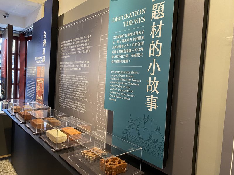 展覽內容從台灣早年建築中使用的各式紅磚說起,如台灣煉瓦株式會社(Taiwan Renga)的TR磚、戰後的台北磚、花磚等,以及建築裝飾的寓意故事,除了傳統東方吉祥圖案之外,也深受西洋元素影響,匠師或屋主甚至發揮創意融入台灣在地元素;放置在屋頂上避邪的「厭勝物」,以不同的造型呈現,每一種厭勝物都有屬於它的傳說故事:台南的劍獅相傳因鄭成功大勝荷蘭軍而起、金門的瓦將軍與火爐口要對著東北季風方向。
