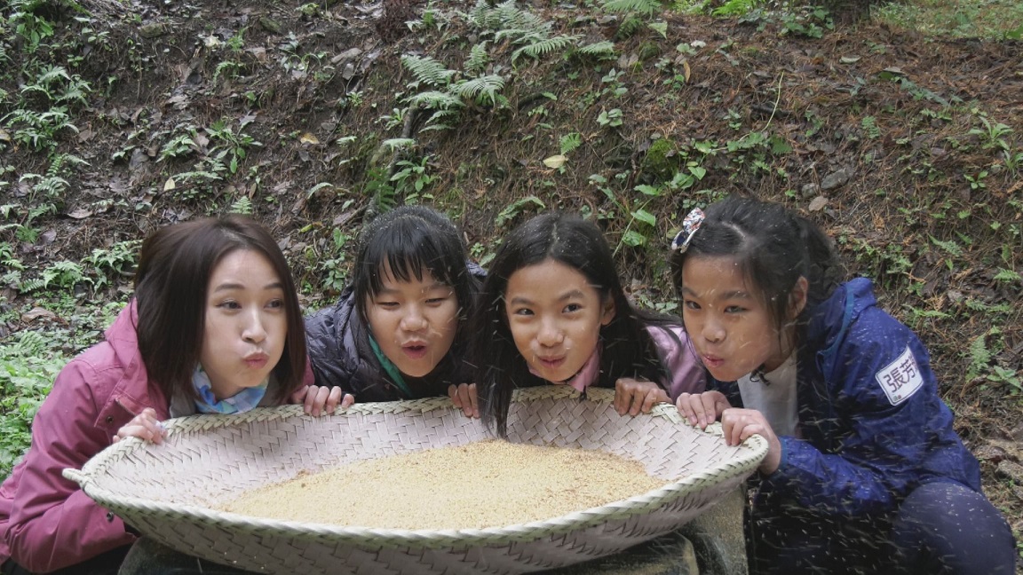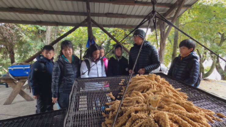 小米得花費數小時脫粒、去殼,才能烹食,玥涵、瑀安、芳瑜很快就迷上了這個泰雅族婦女的工作,聽說部落的女生小學五年級就會做這個工作了,三個女孩發出敬佩的眼神,因為實在不容易。