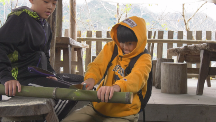 六弟、宥楷、浚恩則跟著拉互依叔叔到山裡砍竹子,光是搬那長長的竹子回部落,重量就有點令人吃不消,但泰雅族男人也是從小就學習這些工作。男孩們也發現部落的人會用竹子來製作許多生活用品,很少使用塑膠製品、也不輕易砍樹,既環保又惜物,和都市的生活差異頗大。