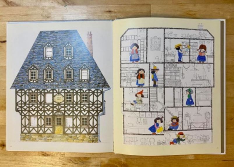 《10個人的快樂搬家》(安野光雅。上誼文化):10個人,兩棟房子,大家一點一點搬過去。「地圖」的概念,不只是「平面」,安野光雅提供了另外的視角——建築物的剖面。(川井深一拍攝自韓文版“즐거운 이사 놀이” Biryongso出版 )