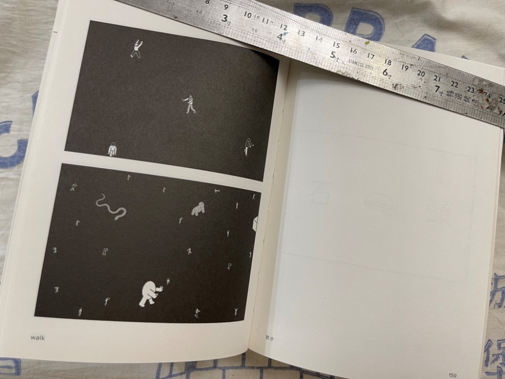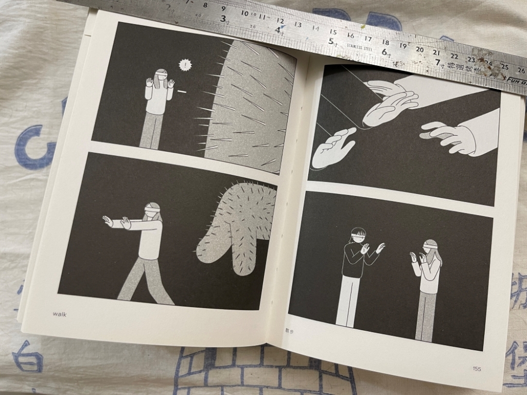 比如這篇《散步》,一個蒙眼女孩伸出雙手探路,摸到了一個刺狀物後退了;接著摸到了另一雙人類的手;接著她們告別,蒙眼女孩又繼續獨自摸索著;接著鏡頭拉遠,我們看到了好幾個像蒙眼女孩這樣的人類,伸手往前摸;接著鏡頭拉得更遠,人變得更小,在這群蒙眼人四週,其實有一個刺狀物、一條蛇;看到這裡就會心一笑,這不是我們的人生狀態嗎?可能會被「刺」刺到、會被「蛇」咬到,而且是難以防備的,因為我們有時就是被蒙了眼啊,又回扣篇名「散步」,則讓故事更輕鬆點,人生的散步危機四伏,作者用「蒙眼女孩伸手探路」這個形象深化了我們盲目的狀態,最後那張上帝視角鳥瞰也像一個棋局,上帝那雙眼其實看得很清楚啊,我們身在其中就只是一個渺小的人類,只能伸長手探路。
