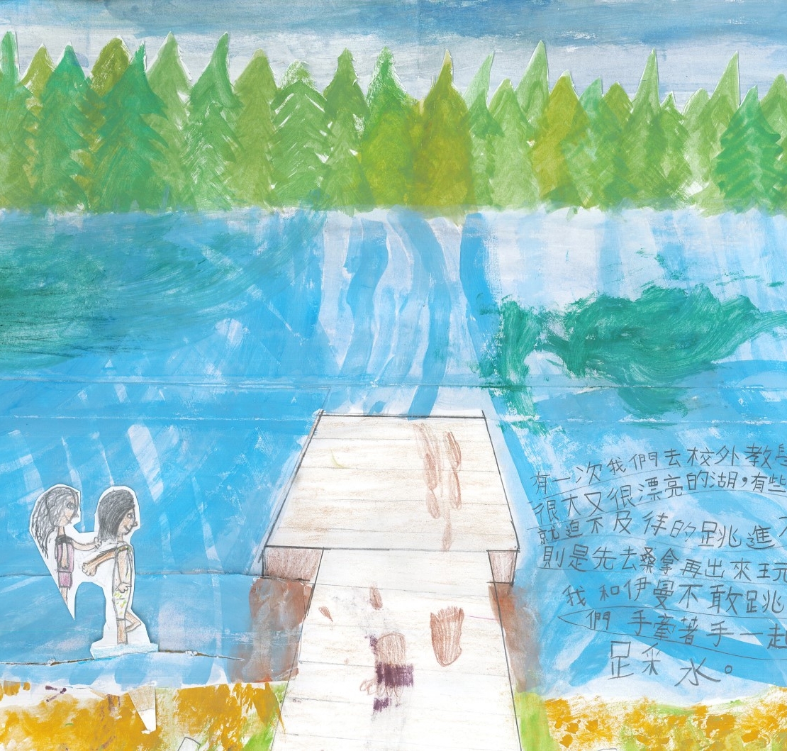 有一次我們去校外教學,那裡有很大又很漂亮的湖,有些人一看到湖就迫不及待的跳進水裡,有些人則是先去桑拿再出來玩水。我和伊曼不敢跳水所以我們手牽著手一起在湖邊踩水。