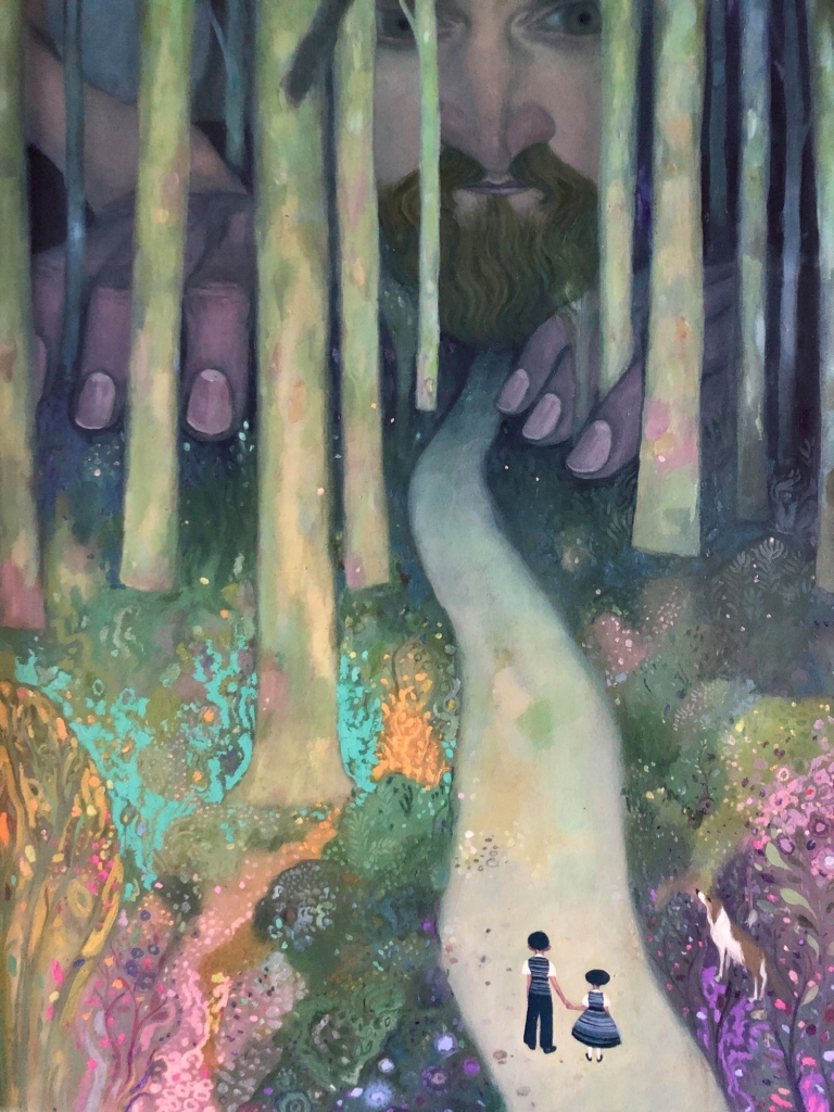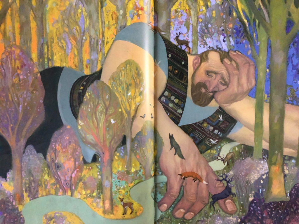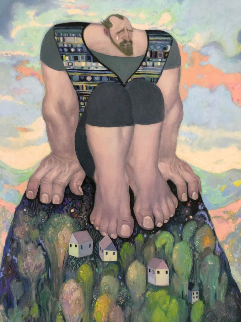 。巨人代表自然力、生命力、真實的色彩就像大自然,人類一直被大自然巨人傾聽著、愛著,