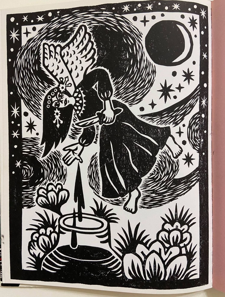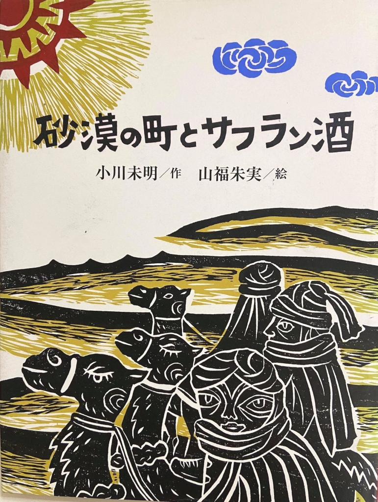 還有一本讀過馬上印象深刻烙痕的、和「來歷不明者」有關的繪本——《沙漠小鎮與番紅花酒》(砂漠の町とサフラン酒,文:小川未明、圖:山福朱実,無中譯) 。說的是一位沒有人知道她從哪裡來的女人,被賣到小鎮上的番紅花酒廠工作,故事沒有明說她受了什麽委屈,但她心裡充滿了怨恨,臨死前,她切自己的手指把血滴到番紅花酒裡,那混了血的酒異常地好喝,於是就被留下來作為酒的原料,這沙漠上的小鎮上就因為番紅花酒聞名起來。慕名來喝酒、散盡錢財的人只好留下來做苦工,有了積蓄後又忍不住去喝酒,這酒的魔力就讓愛上它的人永遠回不了自己的故鄉。
