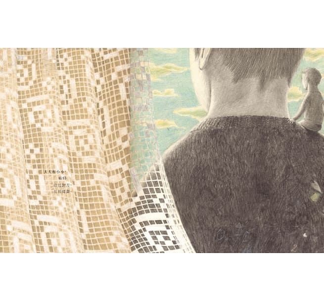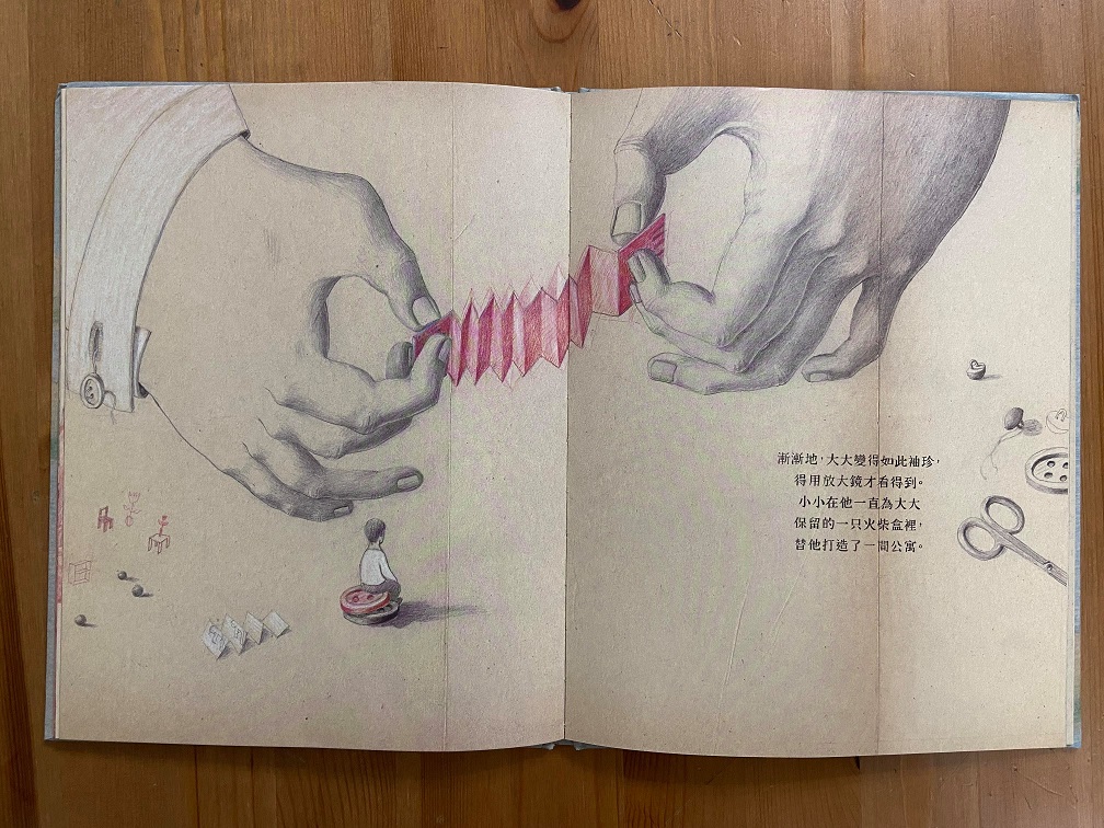 回頭再來前面看來「囉唆」的一大段,最後那句「把故事變成你喜歡的樣子」乍看有點陳腔濫調,讀過很多次才體會到故事中的「大大」和「小小」究竟是什麽——每一次都可以有不同的解讀。消失的「大大」可能是小時候的想像朋友;也可能是害怕面對孤獨時的自我分身;也可能是父母身影的投射……總之,那是一種原來好到不行,後來消失的東西。或者,這是一個試圖解釋「消失」的故事,是人們的自我安慰,肉眼看不見了,想像他留存在紙頁間。那麽,在無數的紙頁上、無數的書頁上,就是人類應對「消失」之道。