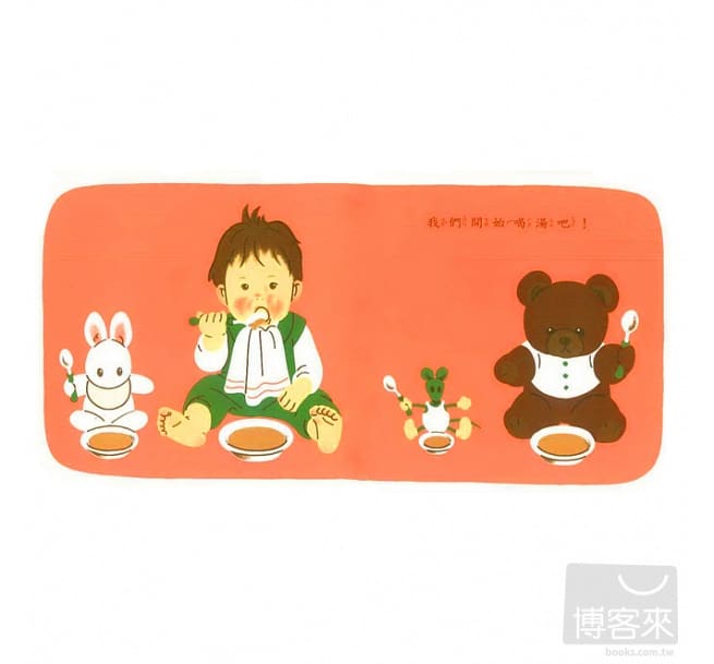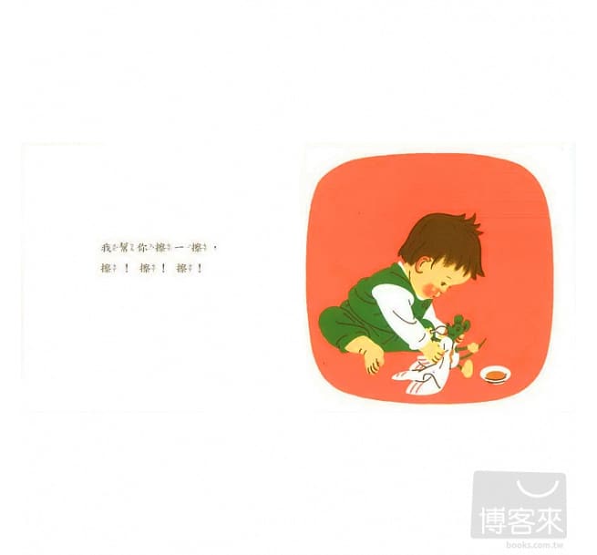 特別是有小孩後,不知道親手處理過多少的、無數的髒污,多到根本忘了原來這叫「擦」,「擦」這動作往往都在無言的怨聲、或麻木中默默進行;可在繪本裡有句重複對白喚醒了我,就是——「我幫你擦一擦」,突然間賦於這個動作新的意義,那是「我幫你」,原來這個動作是在「幫忙」呀!時至今日「我幫你擦一擦、洗一洗」這個動作都不曾消失過,每天都會自我繁殖。