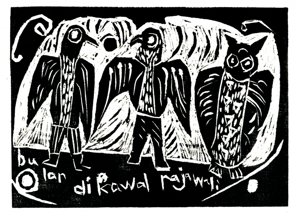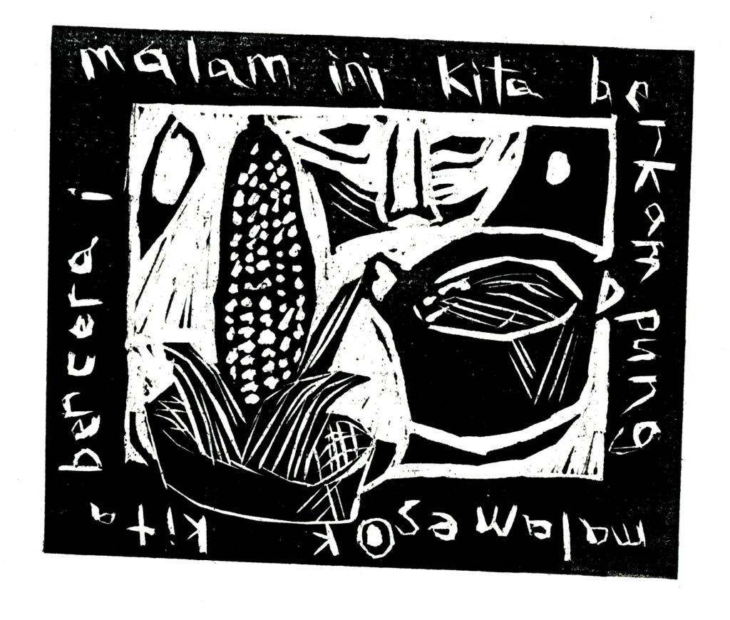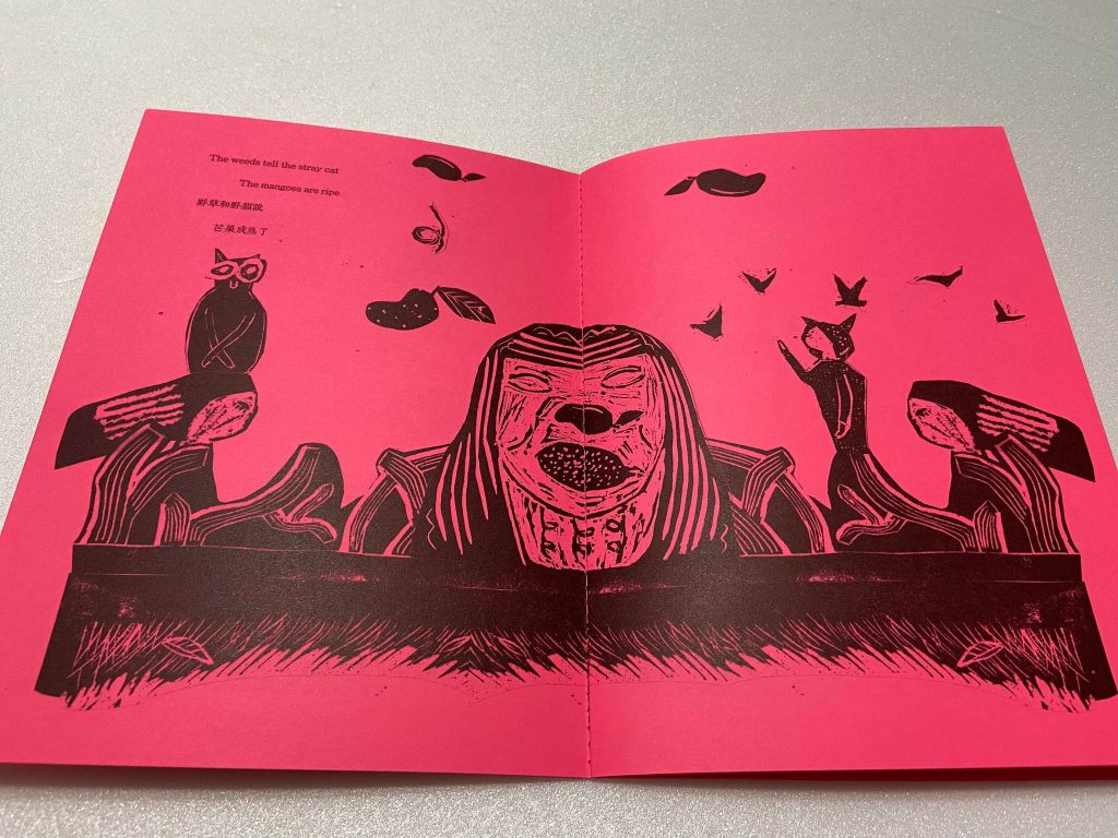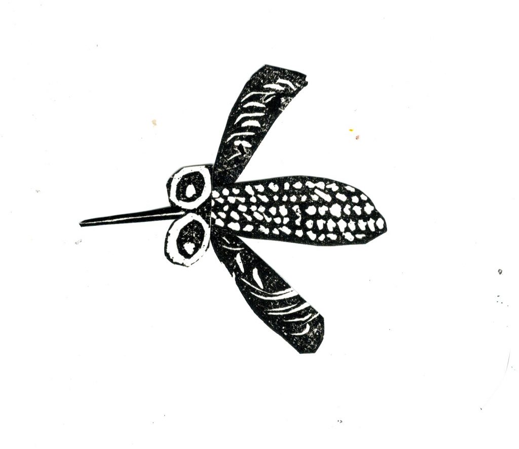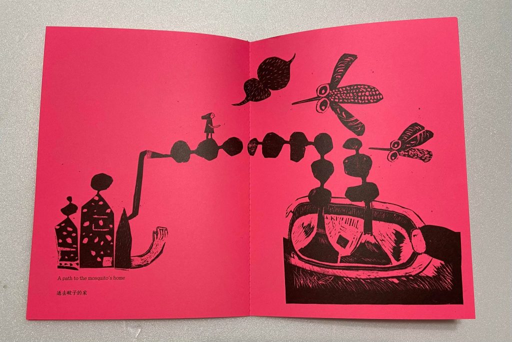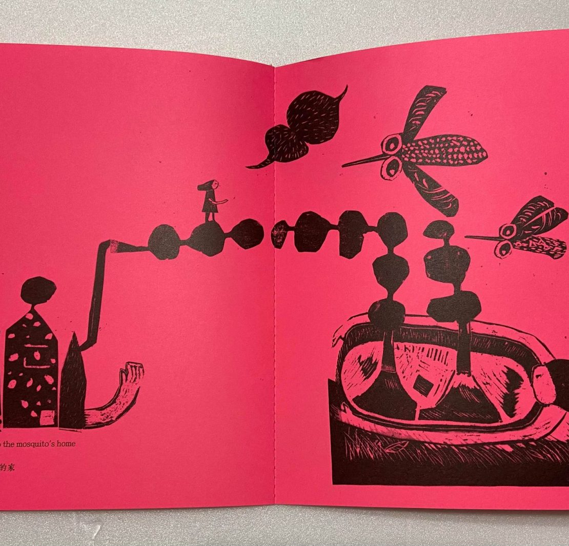 事實上,一旦撇開「像不像」,觀點就會獲得解放,我有一本繪本《姐姐的空房子》裡有一隻蚊子,你說像嗎?沒有很像。如果放一張真實蚊子照片在旁邊是不太像,只有眼睛和長長的口器有點到蚊子的特徵,我是由《以前巴冷刀 現在廢鐡爛》裡的兩張版畫剪成的。(玉米是蚊子的身體;鳥的各一隻眼睛變成蚊子的雙眼;貓頭鷹的翅膀變成蚊子的翅膀。)