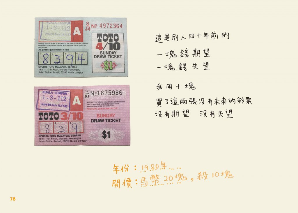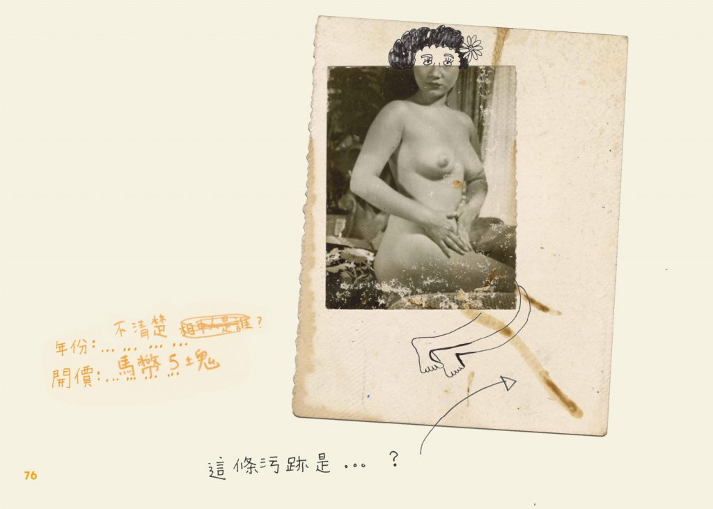 劇末驟然出現了放大的男主角在「霍霍霍霍」磨生鏽刀的畫面,男主角喜歡去二手市集找道具,也善於修復古物;下頁女主角托腮發呆的工作室場景,桌上是她收獲到的二手照片,這男女之別也很到位。接著「劇場」結束,到了書的下半部,是由一幀幀老照片開始的,這部份更具塗鴉筆跡與幽默,尤其是作者的喜好特殊,好收一些「文件類」,真是可以開小型博物館了。她買了兩張過期彩券,寫「這是別人四十年前的一塊錢的期望一塊錢的失望我用十塊錢買了這兩張沒有未來的彩票沒有期望沒有失望」,這堪成古物中毒的神級!