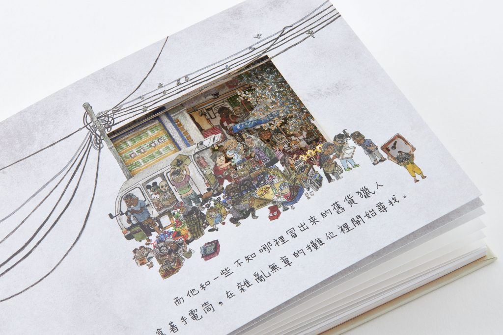 第一次看到「生鏽市集」以這樣「華麗」的方式呈現,老實說有點不習慣。因為在「生鏽」、「二手」的脈絡裡,生出的是一本高單價的書,令我吸了一口氣。因為它已經不是一般的繪本了,而是「立體書」級別,印刷成本高。不過細細讀完後,也確實能感到一切花費巧思的印刷設計賦於「生鏽市集」一種如銅光低調的光、如古物可細細玩味觸摸。