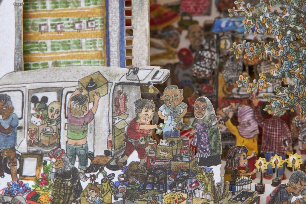 每一頁借由雷雕的「去背」,聚集了市集的某一場景,宛若舞台的一幕幕戲,因為是書的形式,合起來全部場景疊合在一起,錯綜複雜又高高低低,其中細節密佈,因為是雷雕,洞洞也被切得很細 (真的很細),把書側立,每一頁就如半立體舞台一般,就算不讀字,也可以隨著場景,自己配音,裡頭的人表情都很豐富。