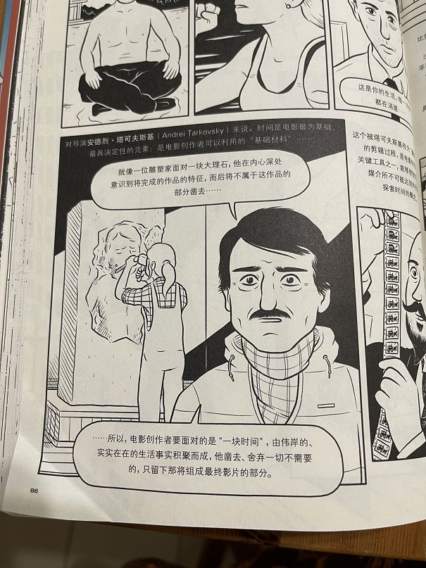 他談到電影中的「時間」這一章,大量引用塔可夫斯基(Andrei Tarkovsky)在《雕刻時光》的概念,用漫畫簡要地傳達: