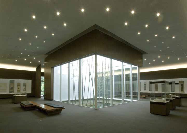 1960 年 10 月 31 日,在一個秋高氣爽的時節舉行了開館式。開館當時的陳列布置如下:正面以竹庭為背景的兩個玻璃櫃裡放著〈三彩立女〉以及日本江戶時代的陶工尾形乾山(1663-1743)作的〈色彩夕顏文茶碗〉;包圍展示室的四面靠牆玻璃櫃中,放著日本原始時代的土偶(埴輪)、平安時代(九至十二世紀)的裝飾佛經和物語繪卷、以及各個時代的日本美人畫、俵屋宗達(十七世紀前半活動)、尾形光琳(1658-1716)等「琳派」名品,還有平假名書法、陶瓷、日本水墨畫等;同時也展出了中國宋代繪畫名品、例如傳趙令穰〈秋塘圖〉、李迪〈雪中歸牧圖〉雙幅、傳毛益〈萱草遊狗圖 · 蜀葵遊䤕圖〉以及中國陶瓷。