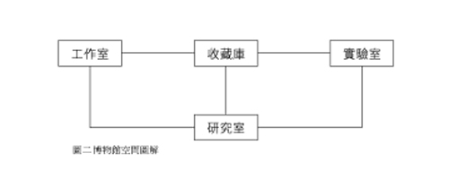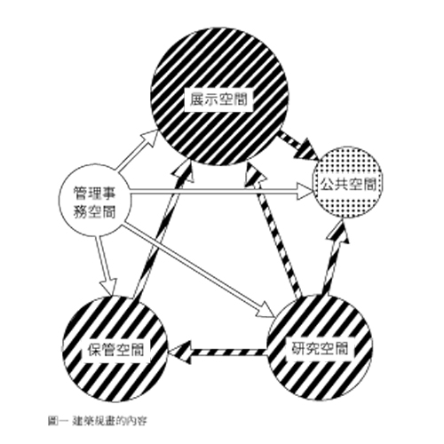 以日本人的資料來說明建築規劃的內容(見下圖一)。首先,要自整體的組織著手,建立一個空間的範式,建築習稱為圖式(Diagram) ;也就是把博物館中各部份的空間關係連結起來,如同日本「建築資料集成」中的圖解。這個圖解,只供參考,並不是所有的博物館都適用,要根據主持人的理念,把自己的圖解建構起來(見下圖二),而且整體到部份,層層都要有圖解。一個製作良好的空間圖解,反應了建築師對這個機構作業關係的理解程度。比如國立自然科學博物館的收藏單位,就是由這樣的圖解建構起來的。所以收藏庫就成為精神的中心,而需要空間特別大的收藏庫就只好放到地下室去了。有了這樣的圖解,下一步要研究的部份為空間數量,也就是要知道多少平方公尺,多少坪。在博物館中,這幾乎完全由政策來決定的。所以要自上而下來分析。一定要注意,在建築規劃前有全館規劃,因此發展目標是建築規劃的準繩。