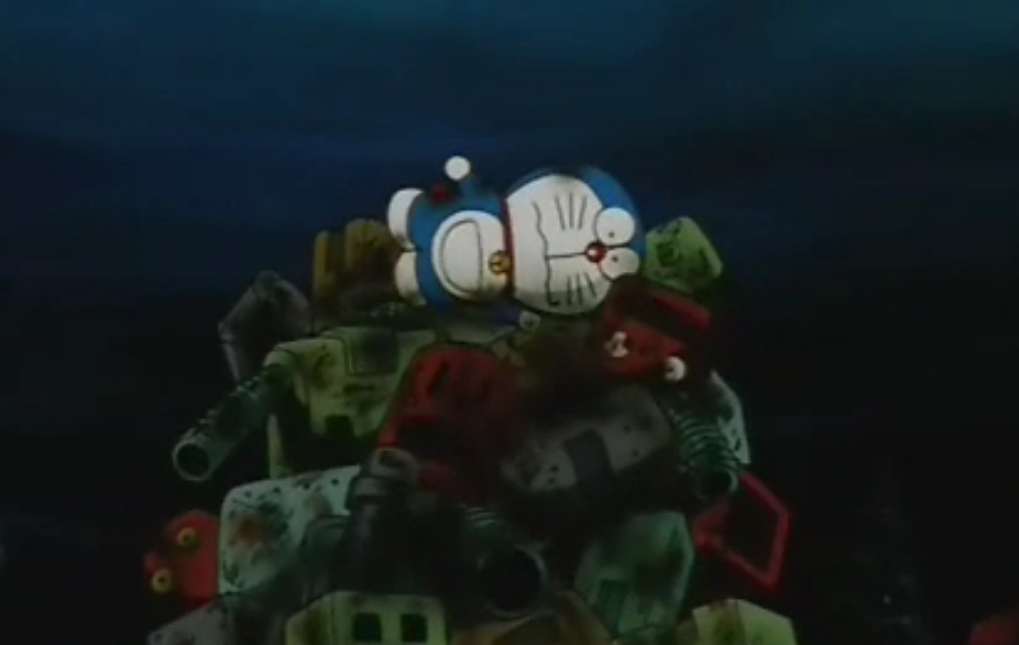 在《白金迷宮》的故事中途,哆啦A夢被嚴刑拷問,完全被摧毀,還被丟棄在海底的垃圾場。