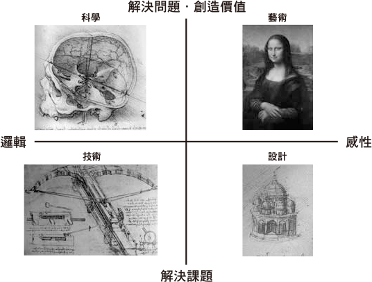 以活躍於文藝復興時期的達文西、亞伯提為首,還有許多跨越四個象限,活躍各領域的創作者。 這四個象限始終互有關聯。接下來就以藝術為軸,分別探討其中關聯。