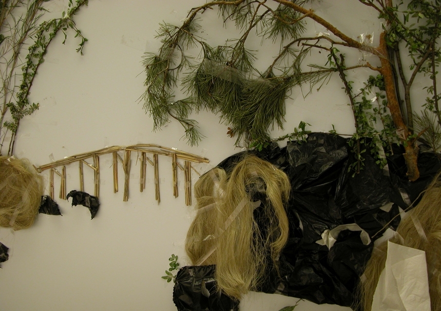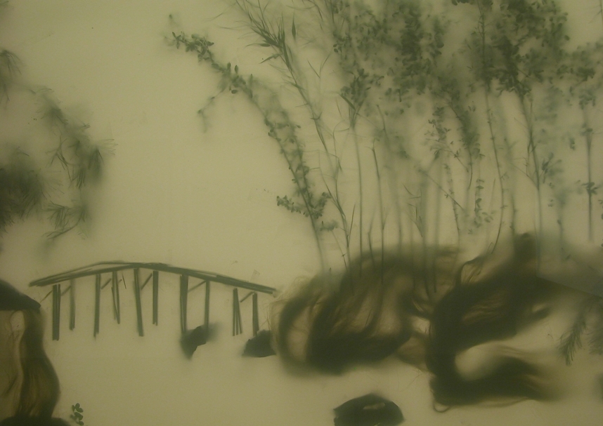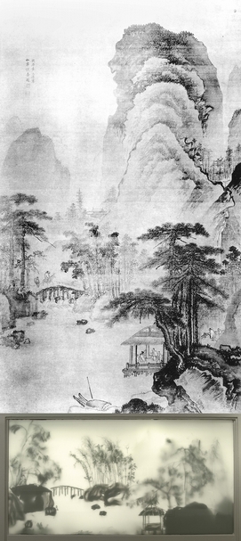 這件作品的靈感來自我經西班牙轉機時,在機場辦公區看到毛玻璃後面透出一盆植物的剪影,它很像一幅水墨畫。這一瞬間我聯想到柏林東亞美術館的展櫃以及那些在異地他鄉的藝術品,同時以往關於中國山水畫的知識、光影的經驗都在頭腦中串聯起來,我開始構思這件作品。