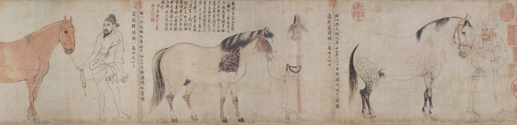 湯垕很清楚意識到這個畫史上的重大轉折,就是李公麟將韓幹絹本上的馬,轉畫到紙本上的貢獻,否則也無須記上一筆。好在有李公麟這樣專業的畫家參與,才使得紙本繪畫技法的探索能夠更加快速、深入與完整,很快就擺脫文人墨戲的幼稚階段。出自徽宗畫院所摹的韓幹《牧馬圖》,整體偏向均勻一致的線條,可以感受到作為輪廓線的功能較多,物體的描繪工作還是利用顏色渲染來完成。反觀《五馬圖》,在幾乎不需要顏色的幫助下,李公麟僅僅透過用筆就完成這一切。例如握繩拳頭與衣袖,透過線條的濃淡、疾澀、圓扁、精緻、粗糙等變化,描繪出物象的真實性。