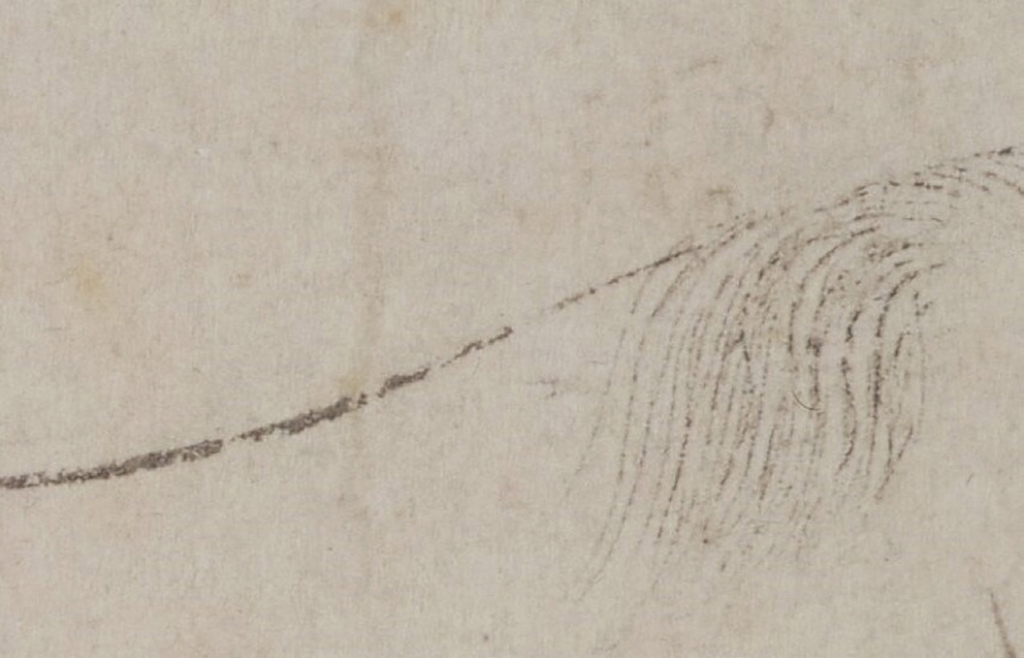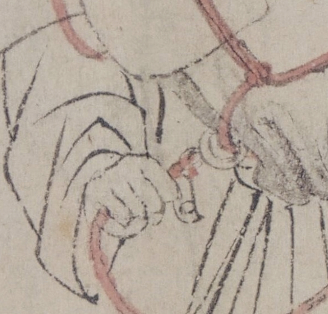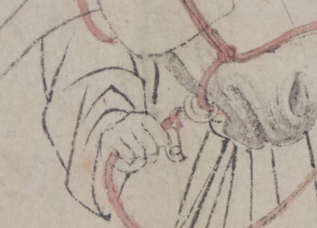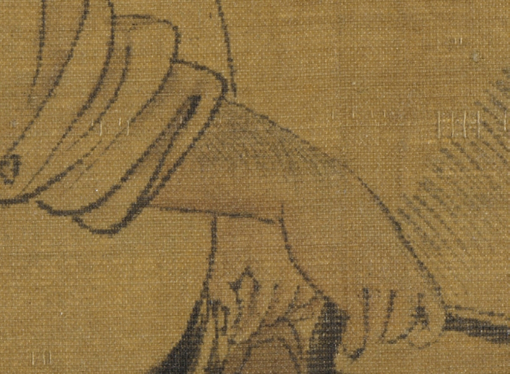 拳頭上方兩道偏鋒的寬扁線條,一圓弧、一方折,利用深色來顯示出突起的衣紋。拳頭處理也相當精彩,輪廓線以淡墨細緻線條處理,呈現血肉的彈性飽滿樣態,指間縫隙則改以稍不確定的偏鋒線條來表現微凹與陰影效果。衣紋邊緣線三個帶折的長線條中,以中鋒圓厚線條表現外輪廓線,轉折後採偏鋒略扁平線條來暗示衣紋摺痕處陰影。這些線條的表現性都有賴於正偏鋒的精準控制才能達到,因為正偏鋒本身就帶著圓扁的視覺效果,適度的精準控制可以暗示觀者所描繪物象的樣貌與特徵。線條圓扁的變化在絹本縱向吸墨狀況不佳的先天條件上,幾乎難以呈現,只能透過顏色層次來表現物象凹凸的效果。