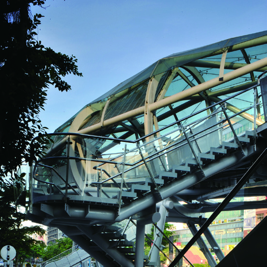 「板橋遊龍」則回到高密度的都市脈絡中,重新詮釋城市流動做為另外一種公共性的可能。廖偉立嘗試讓橋融入城市運行的節奏中,讓一成不變的「步行天橋」除了通行的功能和效率之外,轉換成回看與凝視都市流動街景的潛望鏡。設計上通過引導身體移動的連續曲線路徑,模糊了方向性與距離感,以及內與外的界限,這座橋不僅是繁忙十字路口交通動線的安全連結,更是一個提供多重視角的觀景平台。水平曲線線條呼應著都市路口的移動節奏,橋面上創造出多層次的活動空間,使橋成為人群視線與活動交會,一個城市移動文化的載體。