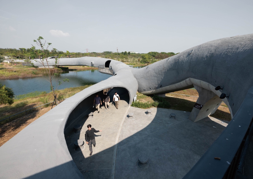 「故宮南院覽月橋」則是廖偉立對結構與美學極限的探索。形態似匍匐大地與水景之上游行的土龍,其設計靈感來自原住民對山景水體的神話意象,他通過流暢卻激進的混凝土管狀結構語言,如大跨距、大懸挑、不斷扭轉、或開或合的拱形曲面,彷彿通過在大地之上飛墨手書的快意,實現了一種身體、時間與空間,建築、水景、山景的靈動交融。橋體的線條與周圍景觀形成和諧的共振,將觀者帶入了一幅詩意的山水畫卷。