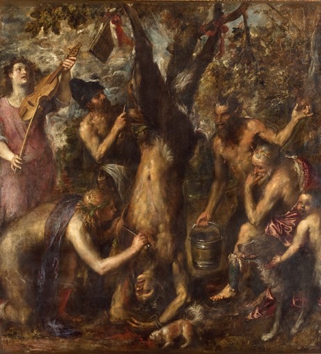 在缺乏光線的情況下,很難分析純粹的恐怖,但最厲害的古典名畫可以同時讓你覺得反胃卻又移不開目光,創造令人無法抗拒的不堪—也或許是一種美麗的驚怖,既吸引人,又讓人反感。提香以狂野的作品《阿波羅與馬思亞斯》(Apollo and Marsyas ,1550-1576)重敘暴戾的神話,尤其令人毛骨悚然。殘暴的阿波羅神,把輸掉音樂競賽的對手—半人半羊的薩提爾活生生地剝皮後,釘在樹上。提香像是揮舞著刀子一樣,以各種激動、令人目眩的符號組合成這個場景(此構成了這個作品的「R—節奏」,畫裡每個人物的手臂動作也有類似的作用)。在這一片騷動中,雖然也有愉悅或熱情的片段—秋天森林裡的葉片和充滿活力的小提琴手,但是中間那名被殘暴的扒開、倒吊的角色,正在被活活地剝皮,一旁的小狗貪婪地吸舔那流下來的鮮血。