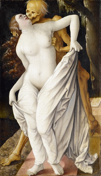 漢斯.巴爾東.格里恩(Hans Baldung Grien,1480-1545)的作品《死神和女人》(Death and the Woman ,約1520 年)也值得一看,畫中的死神欲貼身勾搭形似夏娃的裸體女子,她面露驚恐而試圖轉身朝向襲擊者。死神皮革般粗糙的黃色皮膚,和灰白的頭髮,和這名受害女子牛奶般白皙的皮膚、瀉落的長髮形成對照,死神掐住她的肉體,她則抗拒著死神令人憎惡的吻,卻帶來更加殘暴的咬噬。