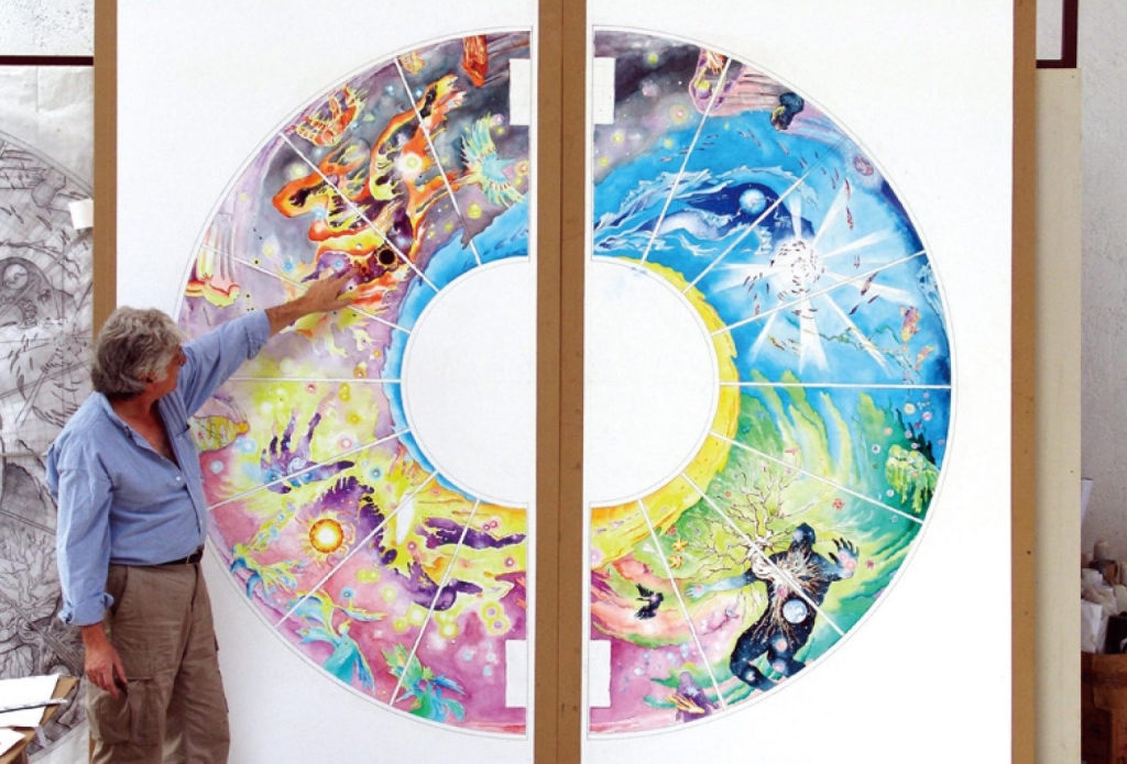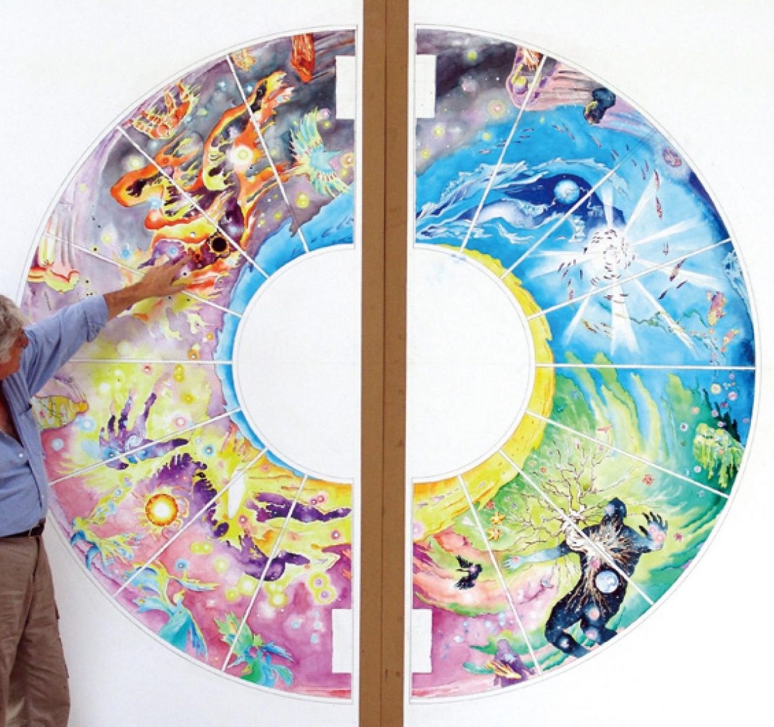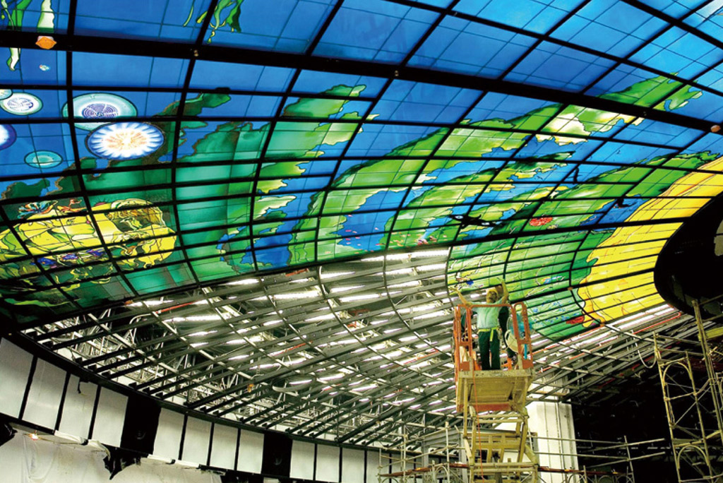 一座直徑二.一三公尺、總面積四.五平方公尺的穹頂,跟一座直徑三十公尺、總面積六百七十平方公尺的穹頂,兩者之間的差距不容小覷。如果要製作玻璃,手邊必須有一比一尺寸,直徑三十公尺的圖樣。要如何從第一步走到第二步,成為首要解決的問題。我想到先製作出一比五的水彩樣,當作整件作品的基礎和參考點,以便掌控穹頂最後的樣貌,除此之外別無他法。如今回想,看來我當時是對的,這方法十分完美。