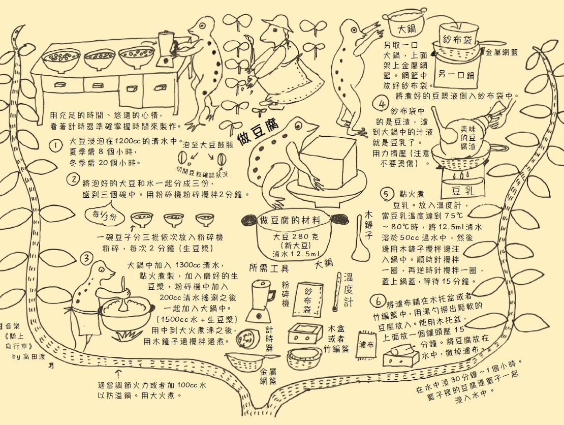 最初幾次做豆腐,都以失敗告終。幾次摸索之後,終於做成了。做豆腐最關鍵的是要掌握好做豆漿時候的火候。這時需大火燒開之後,用木鏟子在鍋中轉圈攪拌,以免糊鍋。如果眼看要溢鍋就微調火力,或是添水,然後再開大火,一定要使鍋中一直保持沸騰的狀態,才能做出濃厚的豆漿。火力不夠,豆漿就容易稀,點進滷水也不會凝固。剛做出來的豆腐,是非常可口的大豆味道。每次必有的豆腐渣,也是軟糯香甜,無比美味。因為豆腐渣太好吃,以至家人直接請求「再做些豆腐渣」。可以同時得到鮮豆腐和豆腐渣,真讓人感覺賺到了。每次看到超市裡賣的豆腐,我總是會想,豆腐渣哪裡去了呢?