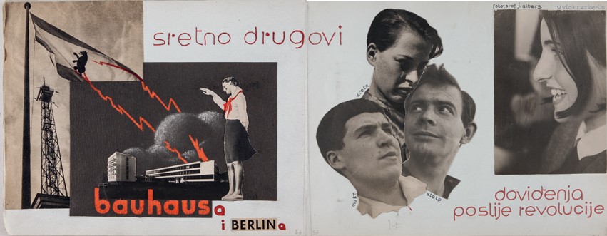 湯真諾維奇自己則出現在包浩斯上方,像個咧齒而笑巨大的年輕先鋒,似乎在迎接閃電襲擊她的母校。三個朋友的頭部照片出現在同志(drugovi)這些字旁邊,就像貼上「同志」的標籤一般,拼貼照片中央為:格雷特.克雷布斯(Grete Krebs)和柯特與梅塔.斯托爾普(Kurt and Meta Stolp)。在右邊是阿伯斯所拍的側面照,頭髮微捲且充滿勇氣。她將它貼上標籤「往柏林的火車上」,並以嘲諷式的歡樂標上字幕:「革命後見。」