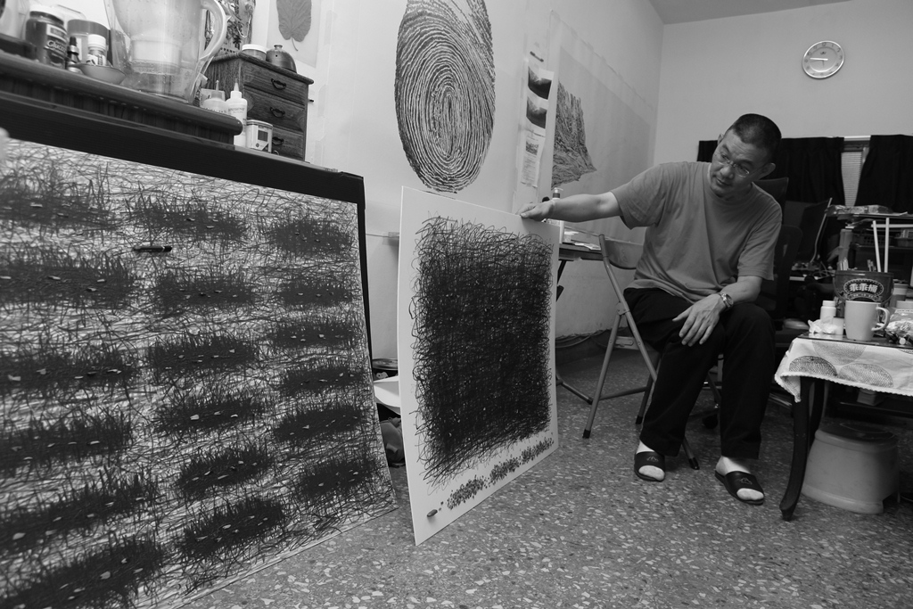 所以說諸相皆空,人生一切皆是虛妄嗎?走筆的石晉華顯然並不全然這麼認為:「如果一枝筆,可以是一個人的一生,那麼在漫長的生死輪迴中,我重複走出的是什麼樣的人生線條?」石晉華從1996年展開了這個詰問般的創作計畫〈走鉛筆的人〉,至今已經在許多地點重複「走」過了近400枝的鉛筆,而這些鉛筆對他來說就是一個個在六道中不斷轉世的生命——儘管這些鉛筆的樣貌、產地和功能都各不相同,但寄宿其中的卻都是同樣的一個靈魂,「對那一枝筆來說,走筆的那一張紙就是它一生的戰場。我沒有機會看到自己一生的所作所為,所以鉛筆就是我自己生命的縮影。」石晉華如是說道,而藝術和創作作為其思索生命和存在的工具,他測量的是今生今世生命的重量和意義,獲得的數值就是他內在平衡的依據。