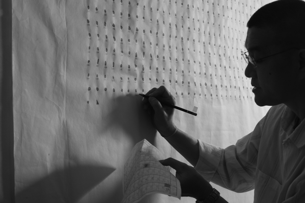 如果生活必須像是石晉華時時觀察和測量自己的身體,或許你就很難對自我生存的狀態掉以輕心。那些數字清楚而絕對地標示你的生命現狀,像是走在一條單薄的鋼索上,而下方沒有防護網,只有深邃的未知。「如果不是因為生病,藝術不會是我的人生選項。」石晉華說道,在他位於高雄工作室的牆面一隅,張貼著一張大大的宣紙,宣紙上規整地排列了深褐色的點漬,而每一個點的下方都標注著日期。我這才恍然大悟原來這是他從2012年開始進行的〈一千日〉計畫,內容是每日持念一千遍「南無地藏王菩薩」的法號,每當完成時便在上面留下一個血點作為記號——對於罹患第一型糖尿病多年的石晉華來說,血液是他測量血糖的必要之物,過去人們利用血書表達自己深重的意念,而石晉華卻是以此作為自己繼續存活的見證。〈一千日〉的旁邊就是石晉華助理的座位,不算太寬敞的工作室裡一共有三位助理正在工作著,他們忙著整理和準備藝術家即將舉辦的個展的諸多資料,就像石晉華自己透過測量的數值,試圖歸納和分析自己生命的徵象一樣。