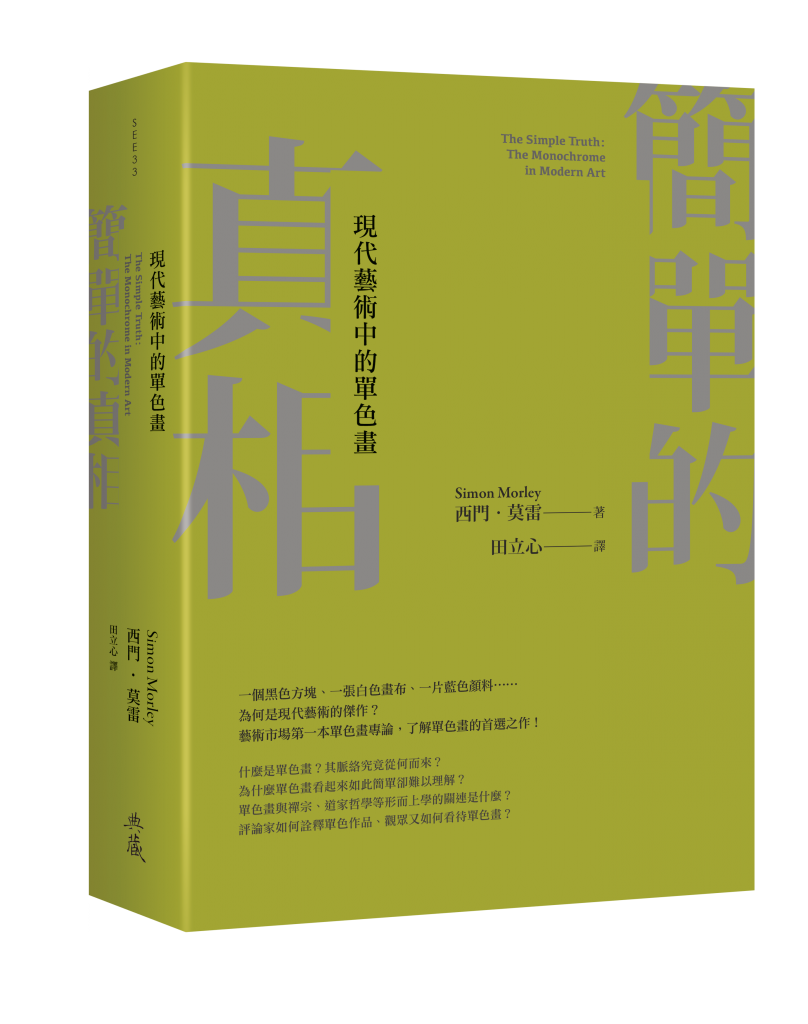 馬列維奇的單色畫,和克萊因、勞勃.勞森伯格(Robert Rauschenberg)及艾德.萊因哈特(Ad Reinhardt)等人在本質上與理想中的單色畫相去不遠,它帶著我們到空白畫布的邊緣,但是多了一點視覺上的活動和複雜性。相對於單色畫(monochrome),把這類作品稱之為單色系(monochromatic)較為恰當,其隸屬德國藝術家、「零群」成員海因茨.麥克(Heinz Mack)於1958年寫的「從理想的單色畫偏離出來的連續統」(a continuum of deviations from an ideal monochrome)。本書也會談到一些較非主流的單色畫,有些讀者或許會覺得意外,因為我們把馬克.羅斯科(Mark Rothko)、巴尼特.紐曼(Barnett Newman)、艾格尼絲.馬丁(Agnes Martin)和盧齊歐.馮塔納(Lucio Fontana)都納入討論。不過為了寫作風格,之後我就只用「單色畫」這個詞彙,即便有時嚴格講起來,我指的是「單色系」。另外,讀者也可能訝異地發現書裡還提到唐納德.賈德(Donald Judd)、埃利奧.奧蒂西卡(Hélio Oiticica)及安尼詩.卡普爾(Anish Kapoor)的單色雕塑、詹姆斯.特瑞爾(James Turrell)、奧拉佛.艾里亞森(Olafur Eliasson)的單色裝置、德瑞克.賈曼(Derek Jarman)的電影、杉本博司(Hiroshi Sugimoto)的單色攝影(不只是黑白照片)以及現成或「挖掘出來」的單色照片,例如大衛.巴徹勒(David Batchelor)的作品。顯然地,單色系藝術作品如何從「單色系」變成一件簡約的繪畫、物體或裝置,兩者之間的界線並沒有清楚的定義。