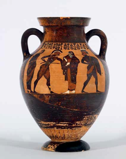 特洛伊城的海倫――根據克里斯多夫.馬羅的說法――她的美貌足以讓千艘戰船齊發啟航;而這個黑繪彩陶雙耳細頸壺(約西元前540 年)所描繪的圖像,正是最早出現的海倫形象之一。