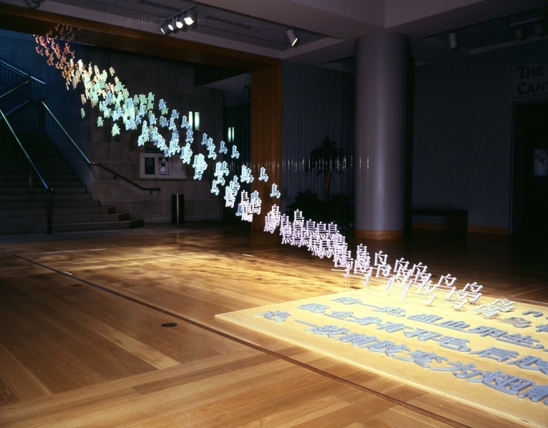 將漢字理解為具有多重含義的、多重潛在可能性的形象,對人們理解徐冰關於漢字的美學而言至關重要。我們可以以徐冰在2001年首次展覽於塞克勒國家美術館(Sackler Gallery)的作品《鳥飛了》(The Living Word)為例。地板上放著一條長長的白板,上面有數行中國漢字,以傳統卷軸的方式來呈現。在白板的一角,「鳥」的當代簡體字,從白紙的空間上升起來,延伸出一系列的「鳥」字,逐漸演變成更古老的字體,並越來越像象形的形式,最終,一隻「鳥」的抽象相似符號騰空而飛。在「鳥」的當代簡體字經歷這個半歷史性、半神話性的演變之時, 它也以彩虹的色彩漸變:開始的黑色逐步讓位於紫紅色、靛藍色、藍色、綠色、黃色、橙色,直至紅色的鳥兒振翅於天。色彩同樣也增加了空間維度:紙上書寫相對的二維空間,被轉化成飛翔的文字的多維空間。不過這些漢字排列的維度並不是體積上的多維,而是多層平面,因為這些漢字是扁平剪裁的,並且按層次排列。
