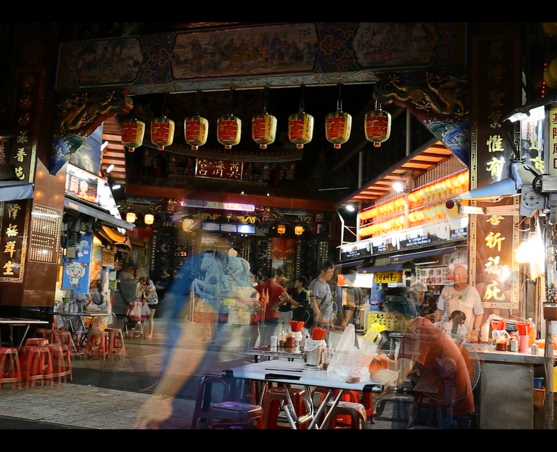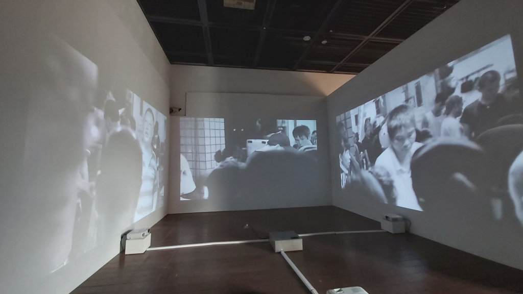 最後,《時津旅渡》這件三頻的裝置作品,出現三個不同空間背景的視頻,構成出一個歷史與地理兼具的景觀。影像中的三個地點分別是基隆三個地標──阿根納造船廠、基隆尊濟宮與崁頂漁市。藝術家在影像中穿插了三段引自余秋雨的《文化苦旅》、普魯斯特的《追憶似年華》和卡爾維諾的《看不見的城市》的引文,作為個人在《時津旅渡》中的文學情境對話。而在同一據點展出的空間裝置《迷網之境》,藝術家郭月女則以大量的廢棄漁網,在此廢墟場域營造了一個幻境般的人工水域景觀。從漁網長廊迂迴走到設置投射燈的室內夕照,再進入一個如洞穴般的小展間,老舊公務鐵櫃上放映著合作者林國銘的漁民記錄影像。從船長、船長家屬、售貨人、補網人等受訪者的訪談中,一個港口城市的生計景象被召喚出。此視覺空間的隱喻與實景再現,同樣召喚了一個城市的過去與現在景觀。